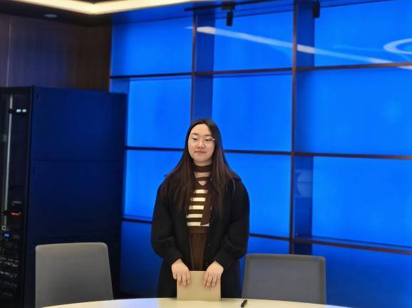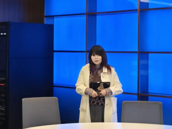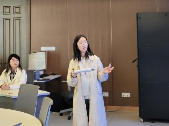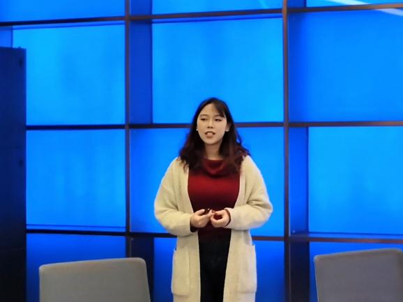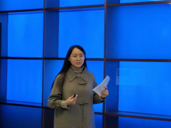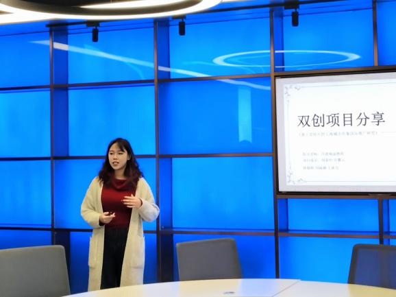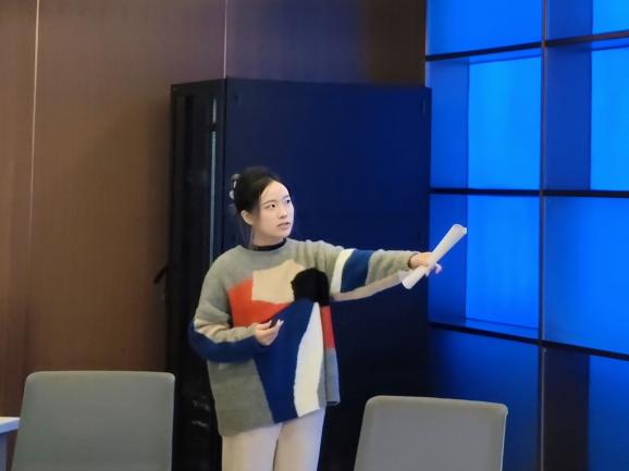 徐菡艺同学汇报创新训练培育项目“情感公众视角下中国人道主义传播受众研究——以土叙地震和台湾地震为例”的中期研究进展。