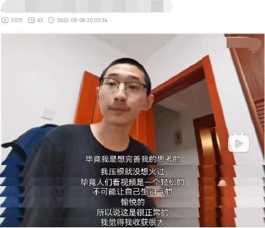从灵感出现到视频通过审核只需要两个小时,但是孕育视频创作灵感的时间长点需要半个月,短时则一两天一个。他不在意视频更新的节奏,他只在意自己是否从上一期视频的回复中有所进步。