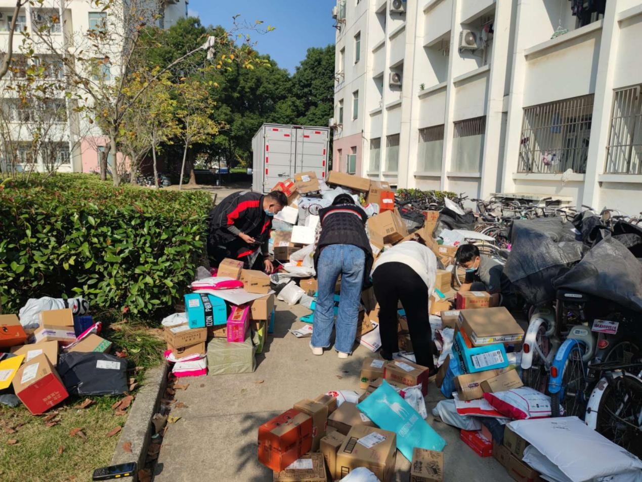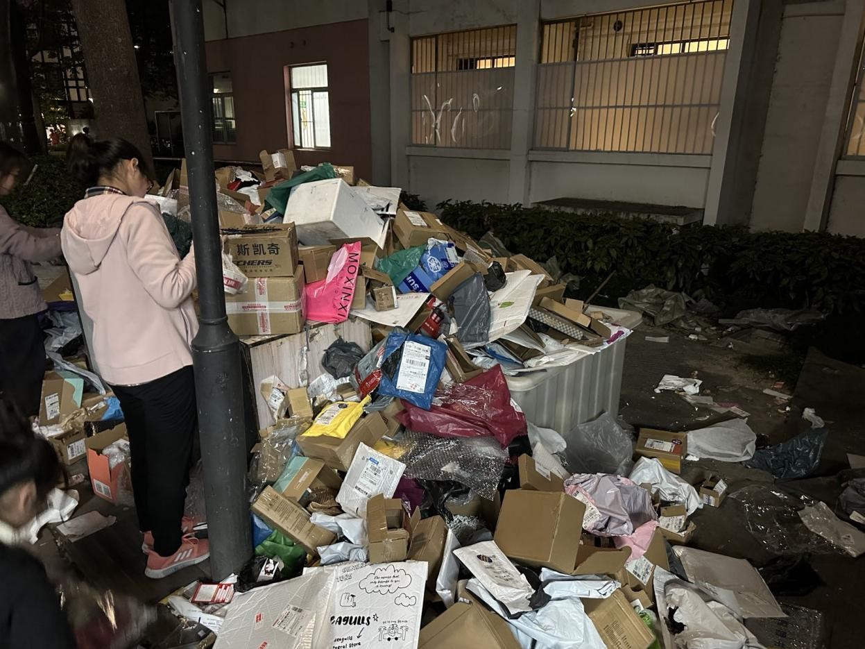 取货出库只是第一关。离开了人头攒动的出库长龙,大批人流直奔向门外右侧的快递拆放点。一张两平方米左右的小木桌周围,数十个学生围成一圈,拆掉的袋子、纸盒、泡沫板,被直接扔到背后的白色塑料筐里。1000余件快递垃圾,有一部分已经溢出到地上,形成了长约3米,高约1.2米的小山。有人直接踩在脚下垃圾的空隙里,踮着脚拆起了包裹。而另一侧的自行车停放点上,不少同学正把一件件的包裹垒在共享单车的车篮里,一摇一摆地载着它们离去。从菜鸟驿站、冬月厅到黄玲玲楼,大批学生们或成群结队,或独自一人,手里提着,胸前抱着三四样包裹,慢吞吞地向宿舍移动。而这只是双十一“疯狂”的冰山一角。