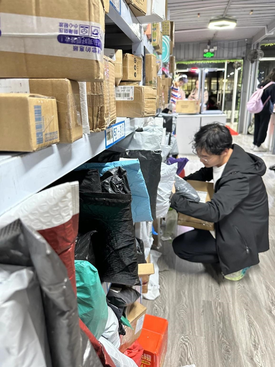 11月3日至10日,大量包裹陆续抵达菜鸟驿站。由于积压包裹太多,很多同学并不能在第一次取件时找到包裹,需要两三次才能找到。沈毅是来领取快递的一员。10月31日之前,他就在电商平台“淘宝”上购买了35件快递,大多是生活用品,例如纸巾、泡面之类。11月2日17:50分左右,他看到手机app“菜鸟”显示有8件包裹待领取,10分钟后他来到菜鸟驿站,花了大约20分钟才取完所有快递。他的一件“零食大礼包”被深埋在其他大型包裹里,他不停地把包裹搬来搬去,最后在一处角落里找到了那件遗失的快递。“(找这件快递)比吊双杠还累”,沈同学一面说着,一面侧身避开来向的人流。