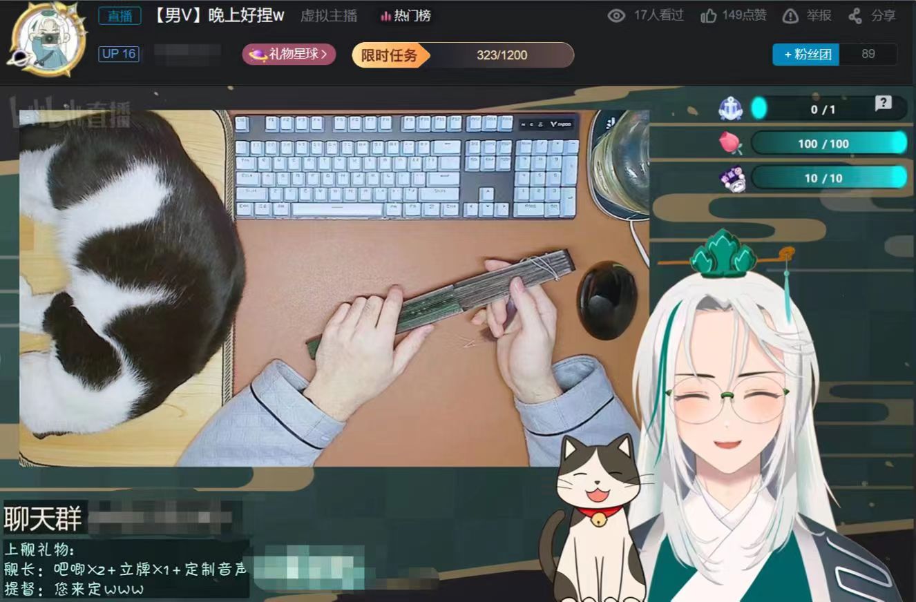 在直播间里,松松的人设是一颗经历上百年修炼,最终幻化成人的松树。他的虚拟形象是一位气质儒雅的古风少年,身边站着一只画风迥异的卡通小猫,这与他养的小猫有几分相似。但与同行相比,松松的皮套看上去很简单,因此价格比较实惠,原画与建模加在一起大约900元左右。为了保证直播质量,松松花800元买了麦克风,还购置了两个用于动作捕捉的摄像头,硬件与软件的总投资大约3000元。
