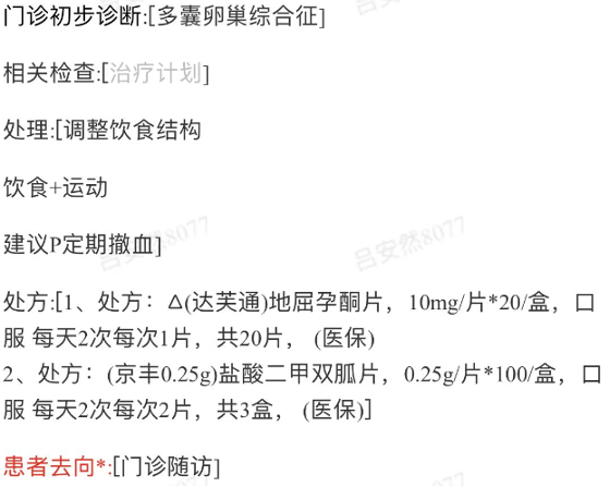 嘟啦不敢去医院,尤其是在痤疮、月经不调等症状加重之后,她害怕确诊某些疾病。当时的她把考研看得比身体健康重要的多,迫不得已才去就诊。2021年的7月,她决定在上海就医,多囊确诊,医生给她开了一个月的短效避孕药催促排卵,并要求她在一个月后复诊。在药物的作用下,嘟啦2021年8月的月经恢复了正常,但忙于复习研究生考试的她并未去医院复诊。2021年9月至2022年3月,月经也再未“拜访”嘟啦。由于持续腹痛,她在朋友的介绍下前往江西九江县城的一家医院妇科就诊,连续四个月服用了达英-35降低身体内的雄性激素,调整月经。2022年6月至今,嘟啦的月经逐渐恢复规律,为了避免激素类药物的副作用,她决定停药,并在2023年春节前后返乡前往医院复诊。