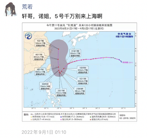 2022年的新生入学日,台风“轩岚诺”预计将造访上海。幸运的是,9月5日下午,“轩岚诺”在越过上海同纬度后,继续向着东北方向移动,并未登陆。然而,台风还是为上海的天气带来了极大的影响,新生入学日当天,上海降雨普遍在中雨量级以上,闵行风雨交加,道路湿滑泥泞。