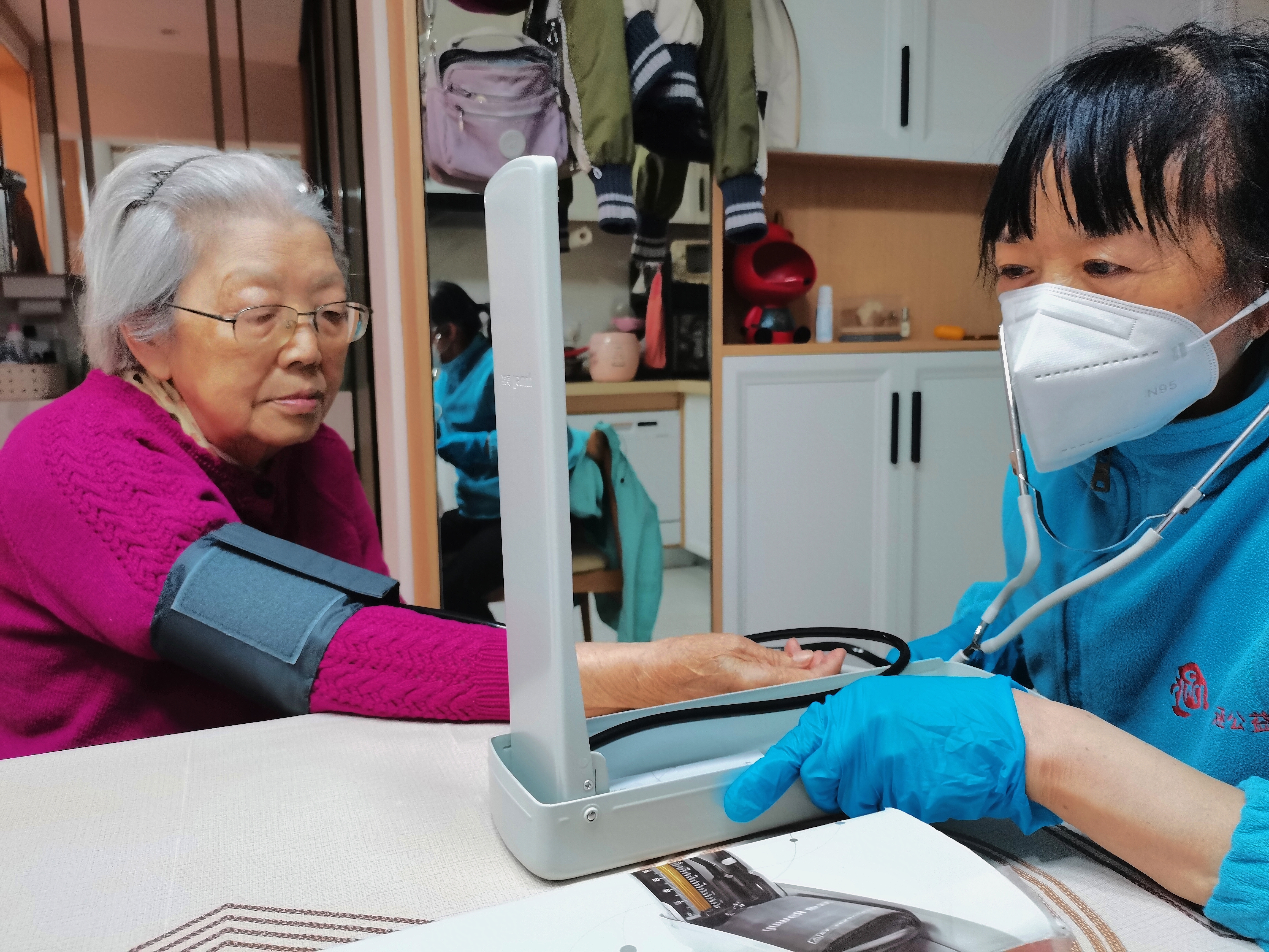 “146,76,阿婆寿命长哦,活得和张学良一样长”,护工黄菊芬摘下听诊器,说着一口略带苏北口音的沪语。“好困觉了,明朝再来望侬”,收拾好工具包,这是她今天服务的第九家,马不停蹄的一天终于结束。