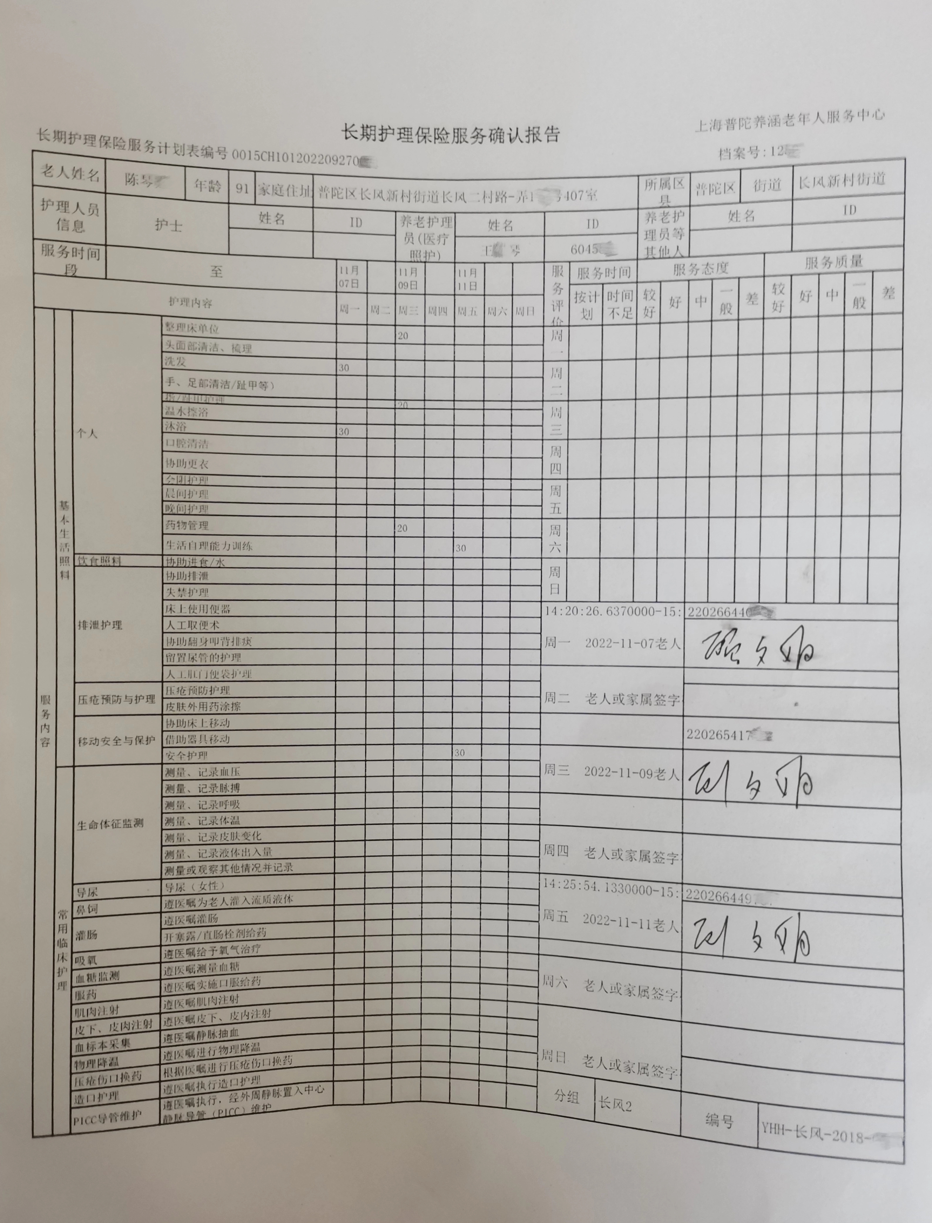 (每位老人都有对应的确认单,护理结束后签字给予评价)