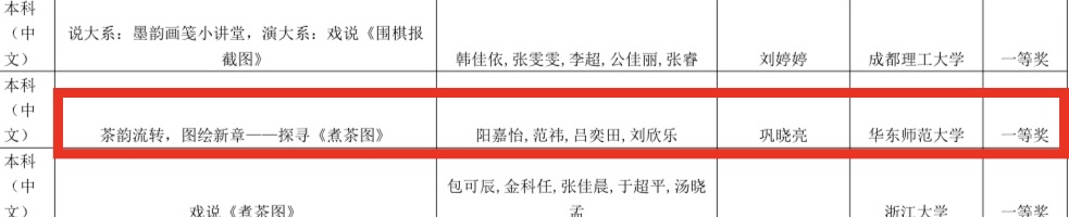 一等奖获奖团队由阳嘉怡(领队)、范祎、吕奕田、刘欣乐组成,国赛初赛作品《风竹轻摇,仕女回眸》从高校的一节艺术赏析课切入,让一位对于画作不甚理解的女大学生走进仇英《修竹仕女图》的世界,让讲解员以文化使者的角色出现,向她,也是向屏幕前所有看到这幅画的观众,从绘画手法、创作心境、时代背景三个方面剖析《修竹仕女图》。国赛决赛作品《茶韵流转,图绘新章》选取明代丁云鹏的《煮茶图》,讲解人作为探索煮茶文化的现代人,选择迈步走进这幅画中,以情景剧的形式探索其中蕴含的茶文化,让一杯佳茗滋润唇齿,馥郁于千年炎黄子孙的血肉,奔流在独属于中华民族的骨髓之中,探索中国煮茶文化这一方独特的文化符号。