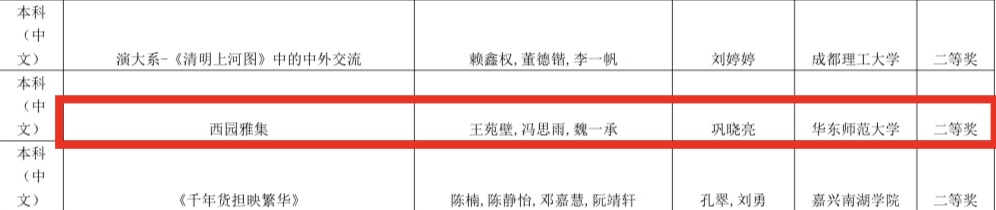 二等奖获奖团队由王苑壁(领队)、冯思雨、魏一承组成,国赛初赛作品《风尘三侠》讲述了隋末唐初的三位传奇人物:虬髯客、李靖和红拂女的故事,再现了中国古代文学和民间传说。国赛决赛作品《西园雅集》以朗诵的形式入手,与宋代文人雅士进行一场精神上的对话,体会他们对于自然、艺术和生活的热爱与追求。
