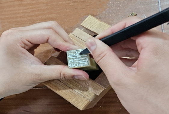 进入实践环节,党员同志们兴致高昂,纷纷拿起刻刀和印石,并根据党纪条例关键词“明纪、守纪、知纪、学纪、知敬畏、存戒惧、守底线”开始篆刻创作。在美术学院书法篆刻专业党员蔡峥同志、吕明姝同志、朱丁丁同志、李沐阳同志的悉心指导下,大家逐渐掌握篆刻的基本技巧,以刀为笔,书写心中对党纪党规的理解。