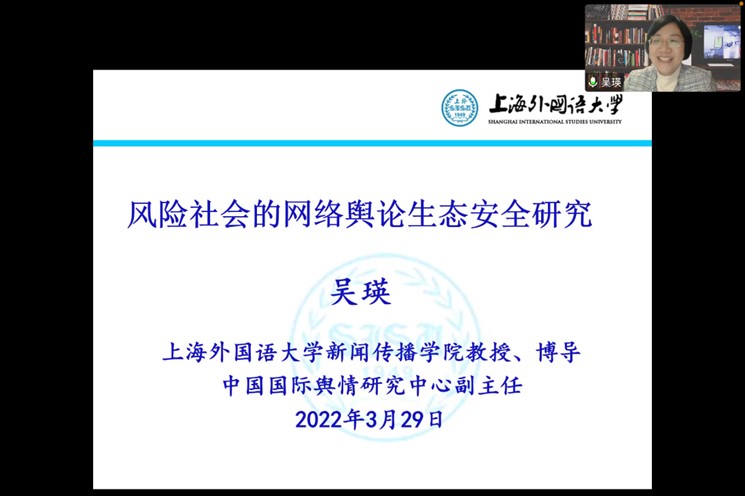 2022329日下午1点,ag亚游-真人ag-亚游平台 三友传播学术沙龙第35讲在腾讯会议平台进行。本次讲座由上海外国语大学新闻ag亚游 教授、中国国际舆情研究中心副主任吴瑛担任主讲人,以风险社会的网络舆论生态安全研究为题,从风险社会网络舆论生态、舆论生态与国家安全、网络舆论监测、网络舆论分析四个方面向各位同学详细阐释了她对于风险社会的网络舆论生态这一问题的思考。ag亚游 甘莅豪教授担任了本场讲座的主持人,并与吴瑛教授进行了对话交流,四十余位研究生参与了本次讲座并进行了深度的互动交流。