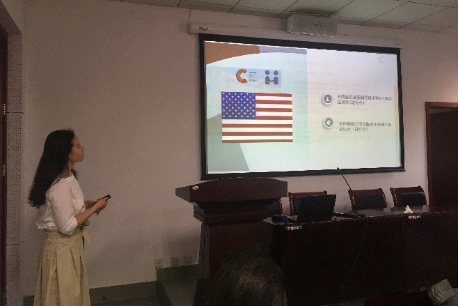 接着,外事秘书吉思琪老师重点介绍了院系层面的交流项目,涉及到与美国、英国、澳大利亚、中国香港、中国台湾、中国澳门等多所境外大学的合作情况,她详述了ag亚游 各合作院校的可选方向及录取条件,为同学们提供了切实的建议。