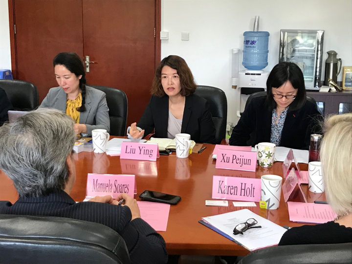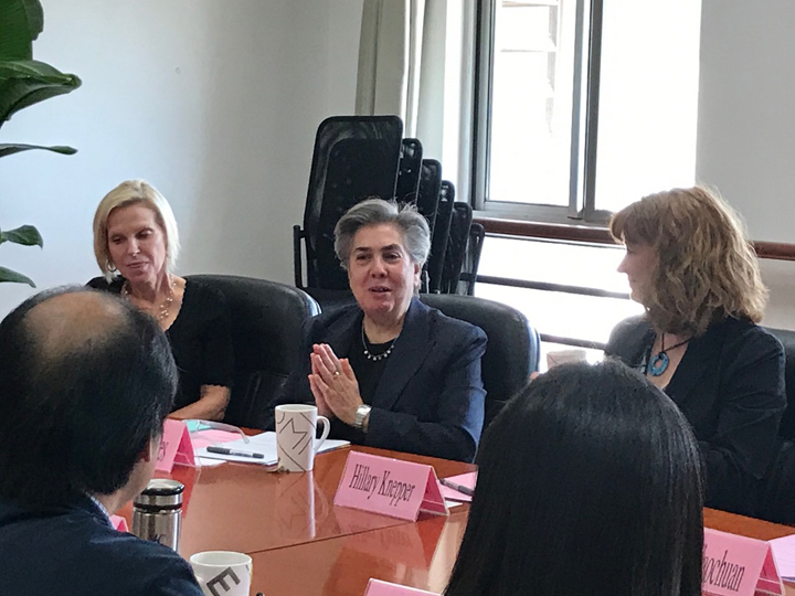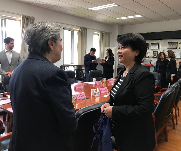 陈虹副院长对Hillary J.Knepper一行的到访表示欢迎,并简单介绍了学院情况。Hillary对学院的热情接待表示感谢并介绍了佩斯大学的概况,随后由出版系主任Manuela Soares介绍了该校出版系的学科特色、师资力量与课程设置。接着,吉思琪老师从国际交流等方面介绍了我院的发展情况,刘影老师则对出版系的专业建设情况进行了详细说明。之后,双方就已签署的针对我院编辑出版学专业同学的本科硕士“4+1”衔接项目展开热烈的探讨。会谈后双方达成共识,均希望在课程共享、学生交流等方面深化合作,为两院学生创造更多的学习交流机会。