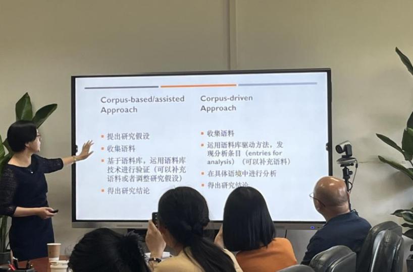 随后,王国凤老师具体讲解了怎么样做定量和定性相结合的研究。她向同学们介绍了Corpus-based/assisted Approach和Corpus-driven Approach两种方法的操作流程,并以自己发表在Social Semiotics的论文Categorisations of developed and developing countries in UN news on climate change为例,对提出研究问题、确定理论视角、收集语料、选取研究方法、进行实证分析、得出研究结论的论文设计流程进行了详细的介绍。此后,王老师为同学们介绍了这类实证性论文的框架和要求(比如,摘要、介绍、研究方法、结论等各部分的写作规范和篇幅长短),以及国外期刊评审标准,干货满满。