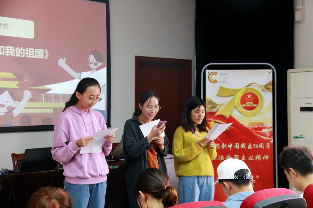 在第二个环节中,2019级研究生党员杨瑞、万梦雅、刘佳卓合作朗诵了诗歌《我和我的祖国》。在伴奏声中,他们道出了对祖国的热爱和尊敬,收获了大家热烈的掌声。
