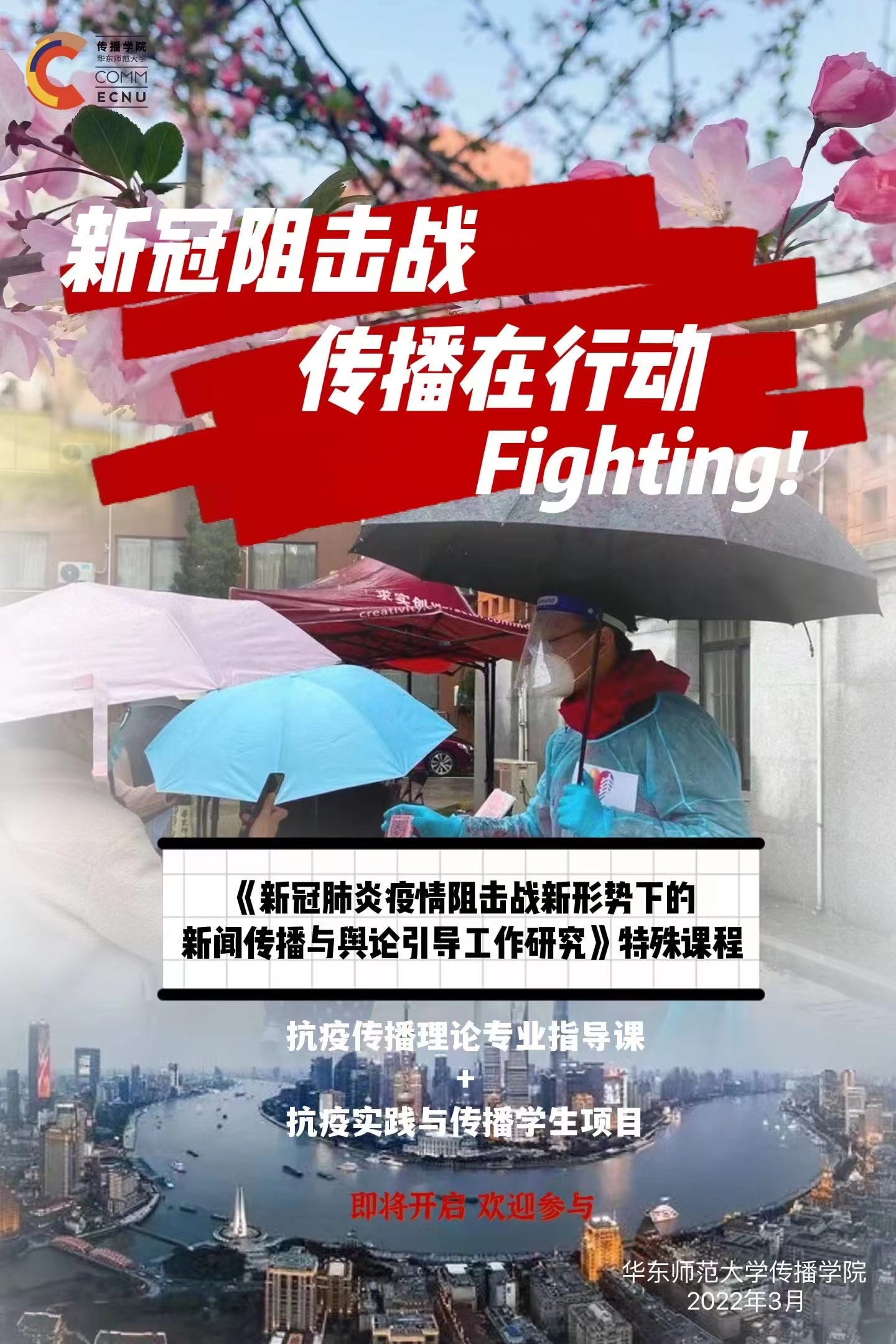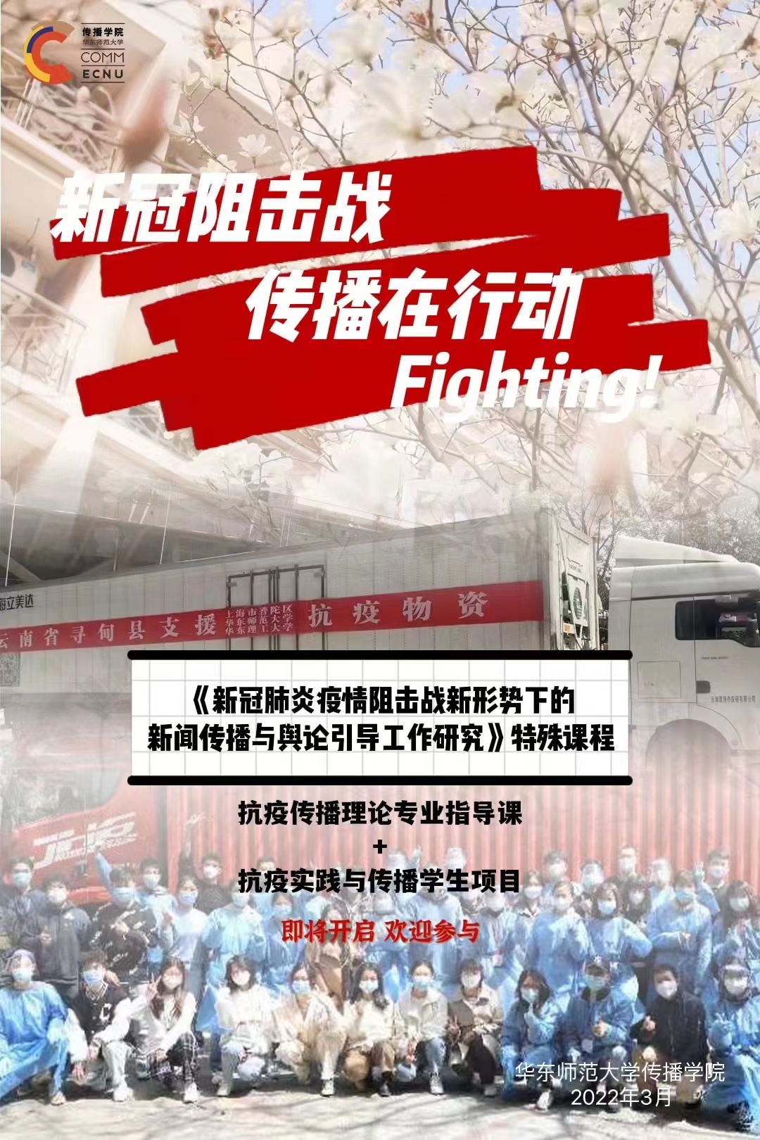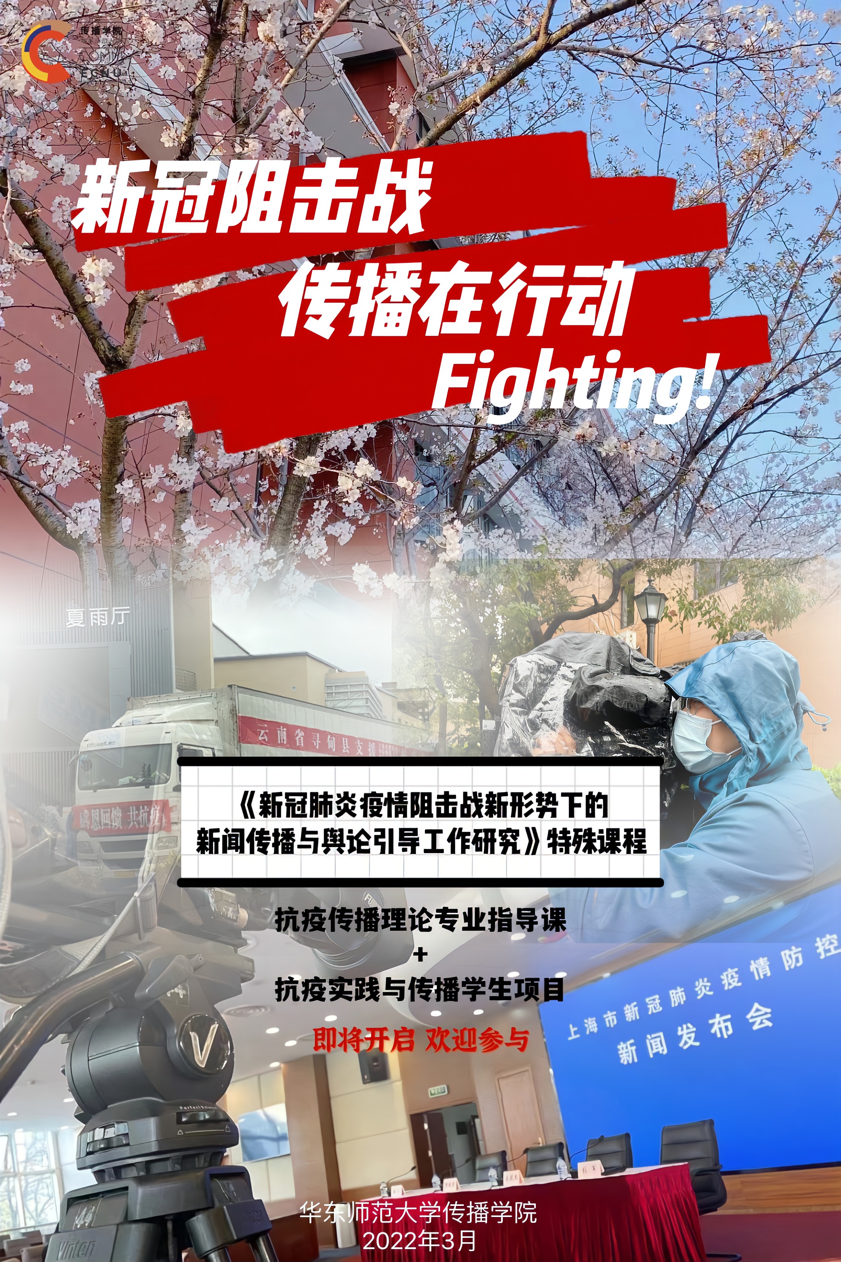 当前上海正处于新冠疫情防控的关键时期,学校仍在封闭管理阶段,全校师生共克时艰,守望相助。ag亚游 在上海市委宣传部部校共建办公室指导下,面向ag亚游 和其他院系学生发布“抗疫实践与传播”项目作品征集公告,希望同学们踊跃参与,以师大人独有的敏锐和关怀,记录身边的正能量,参与专业传播实践,形成新闻报道、访谈文章、记录视频、公益广告、数据新闻及美术摄影等多种形式的作品;同时,亦可通过观察分析主流媒体在此次疫情阻击战的报道实践,形成调研报告、案例分析或研究论文,为上海的抗疫工作做出自己的应有贡献。