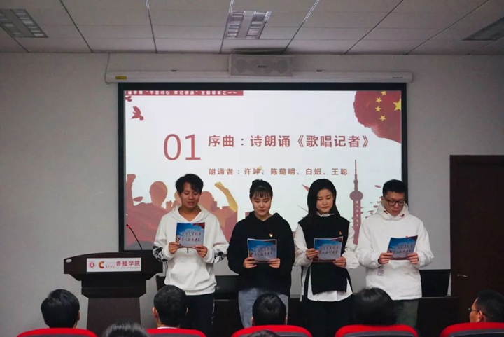 在开篇环节,许坤、陈璐明、白妞、王聪为大家朗诵了诗歌《歌唱记者》。四位党员同志饱含深情、铿锵有力的朗诵,使在场的每个人都深受感染,也让大家深切体会到记者的重要职责与使命。正如原新华社社长郭超人所言:“记者笔下有财产万千,有毁誉忠奸,有是非曲直,有人命关天”。作为一名未来的新闻工作者,应以笔为武器,饱蘸激情,鞭挞假丑恶,歌颂真善美,洞悉社会百态,关注民主进步,为党为国为人民立言记事。