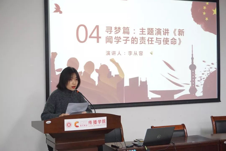 在寻梦环节,李从容同志进行了题为《新闻学子的责任与使命》的主题演讲。虽然科技革命使传统的新闻生产、分发领域发生了巨大变革,但新闻记者仍有不可取代的重要价值。做好新闻报道,必须要高举旗帜、引领方向,围绕中心、服务大局,要坚持为社会主义服务、为人民服务,要保证新闻的真实性、坚持实事求是的原则。作为年轻的新闻学子,我们有新闻梦,更有中国梦,寻梦路上,我们应当坚定理想,坚守责任,提升专业素养和技能,真正成为党的政策主张的传播者、时代风云的记录者、社会进步的推动者、公平正义的守望者。