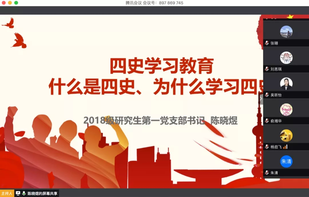 2018级研究生第一党支部在党员大会结束后,全体党员开展了四史学习教育活动,由支部书记陈晓煜主持,开展“四史”学习教育党支部书记专题党课。党课内容主要分为两部分:“四史”是什么以及为什么要学习“四史”。