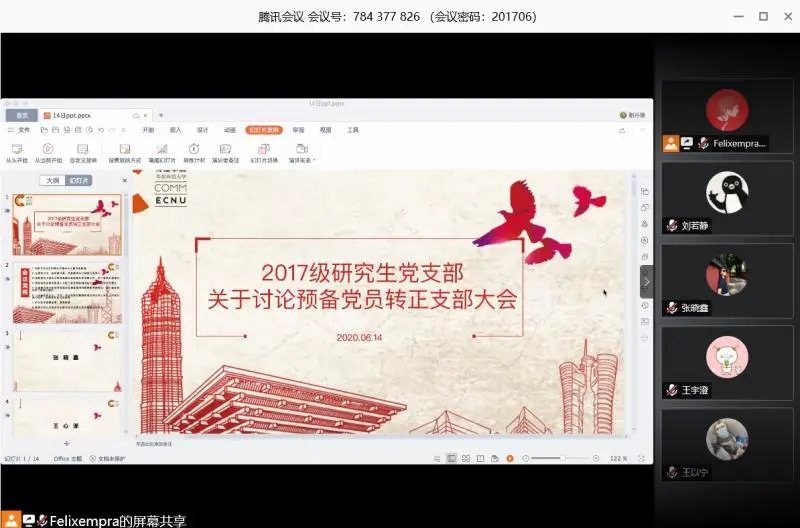 2020年6月14日,ag亚游 2017级研究生党支部预备党员转正大会暨2020届毕业生党员离校教育专题组织生活会在线上顺利召开。
