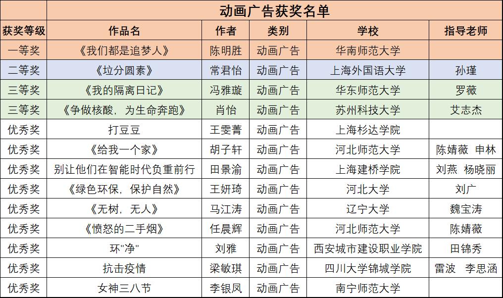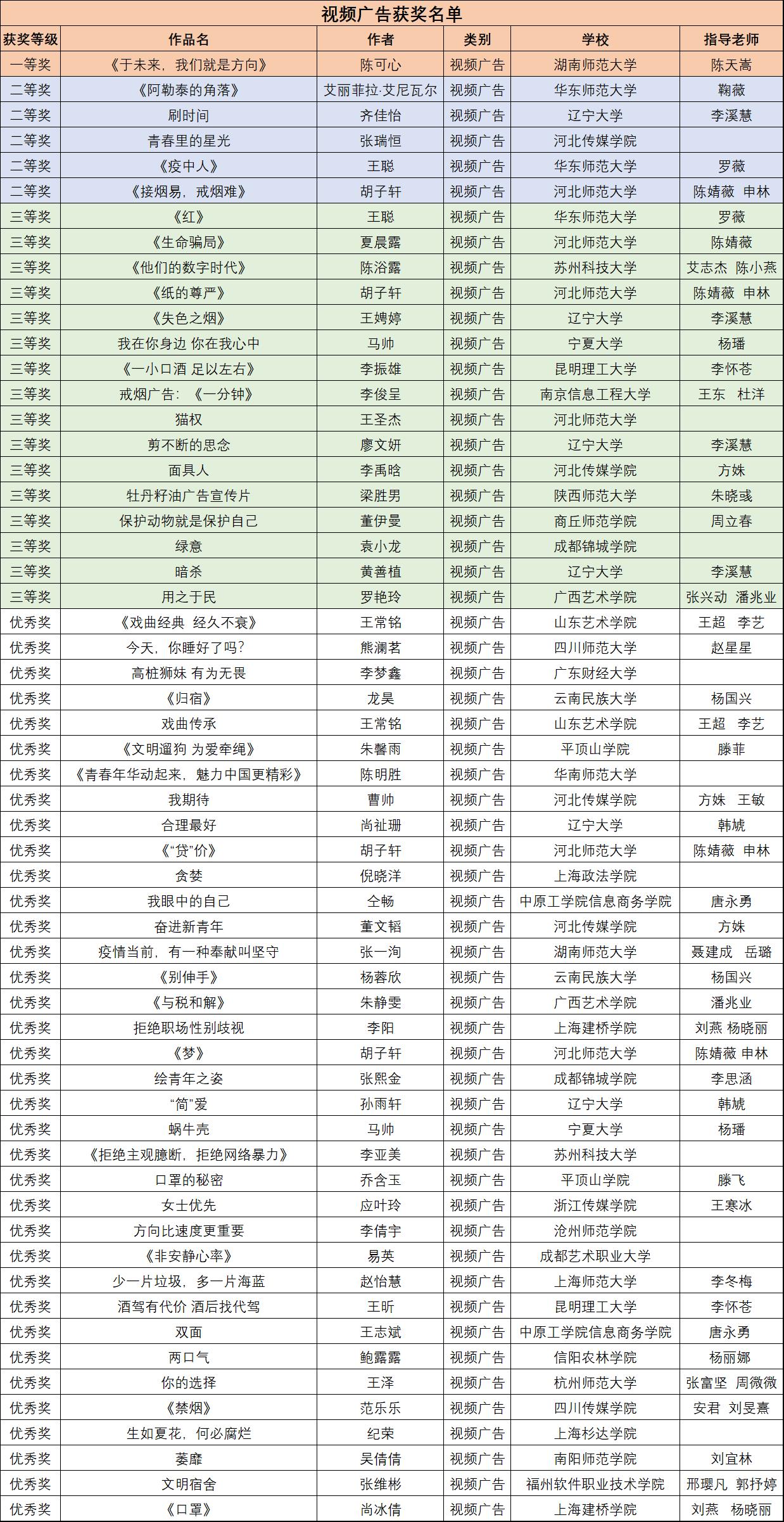 第十五届上海大学生电视节视频广告大赛以公益广告为命题,2022年3月31日至6月30日征集参赛作品,共征集来自65所院校报送的770件参赛作品。经组委会慎重筛选,入围评审作品数量共304件,其中,动画广告22件,视频广告104件,微电影广告178件。经过三轮评审,有4件作品获得一等奖、15件作品获得二等奖、40件作品获得三等奖、102件作品获得优秀奖。 其中,微电影广告一等奖 2个、二等奖 9个、三等奖 22个、优秀奖57个;视频广告一等奖 1个、二等奖 5个、 三等奖 16个、优秀奖 36个;动画广告 一等奖1个、二等奖1个、三等奖 2个、优秀奖 9个。感谢“知乎”“浣肌”“长安欧尚”等品牌对赛事的关注。
