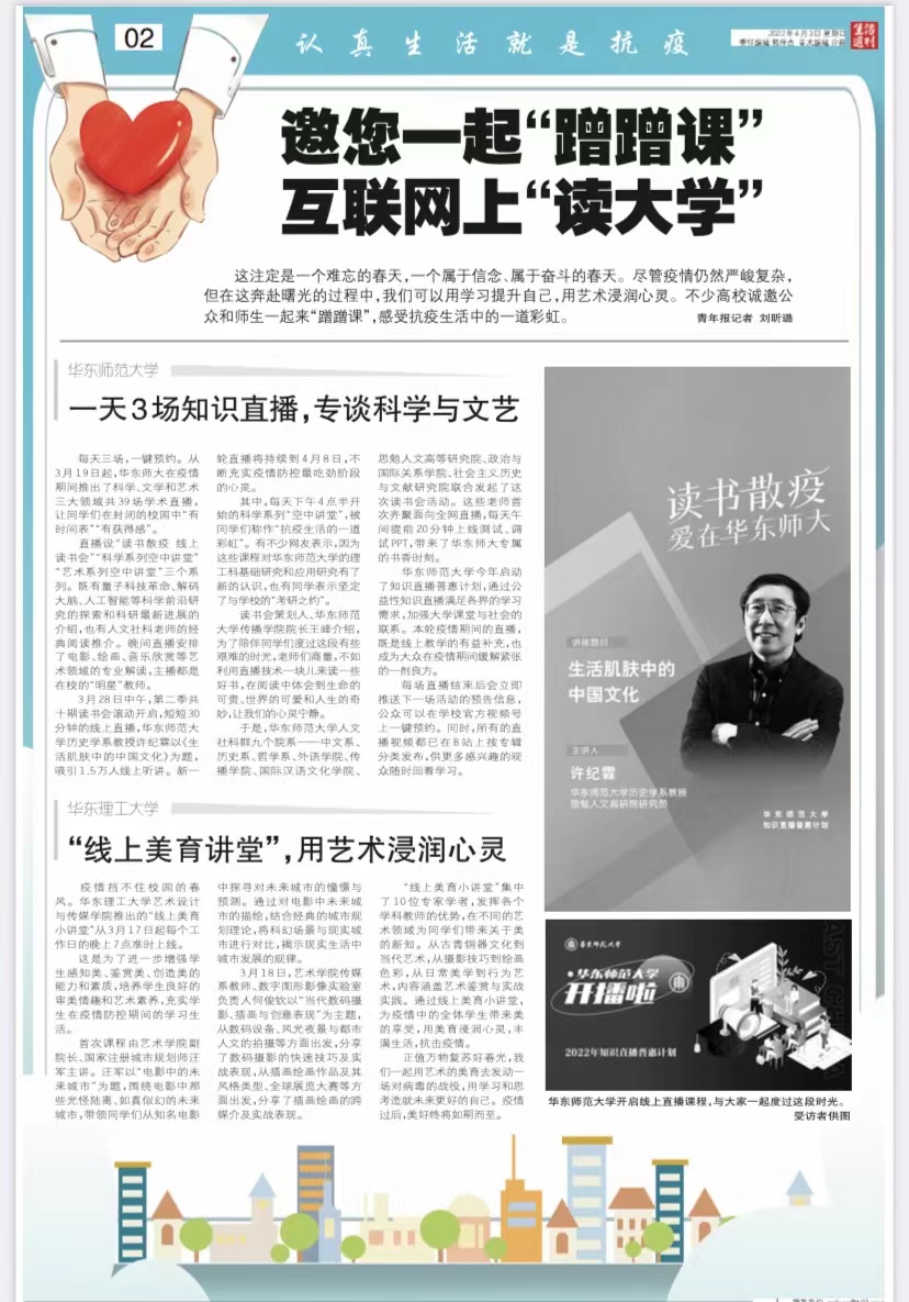 华东师范大学今年启动了知识直播普惠计划,通过公益性知识直播满足各界的学习需求,加强大学课堂与社会的联系。本轮疫情期间的直播,既是线上教学的有益补充,也成为大众在疫情期间缓解紧张的一剂良方。