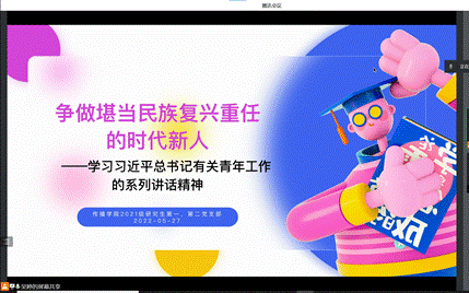 2022年5月27日,ag亚游 2021级研究生第一、第二党支部五月组织生活会顺利召开。为积极贯彻落实防疫政策,全体支部党员汇聚“云端”,深入学习习近平总书记在中国人民大学考察时的重要讲话,共同领悟习近平总书记有关青年工作的系列讲话精神。本次组织生活会主要围绕“争做堪当民族复兴重任的时代新人”进行学习交流,旨在引领广大党员坚定信念,在奋斗中挥洒青春热血。会议由ag亚游 2021级研究生第一党支部书记吴婷同志主持。