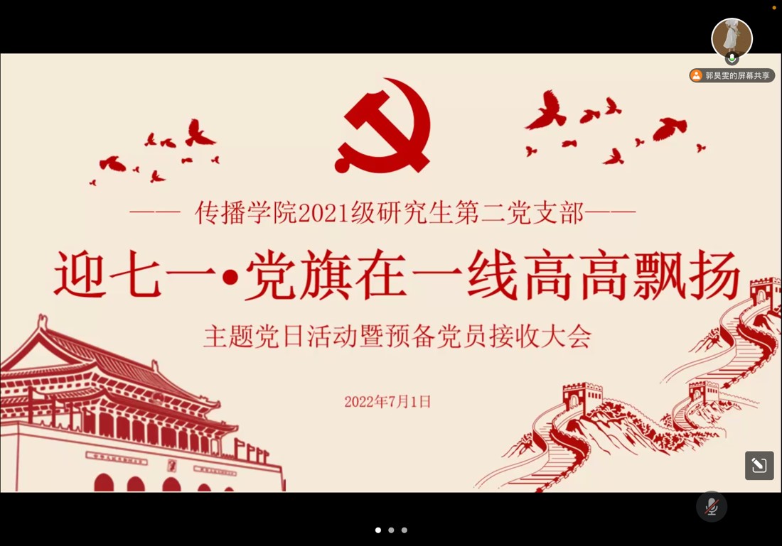 2022年7月1日,ag亚游 2021级研究生第二党支部全体党员和入党积极分子相聚云端,共同开展“迎七一·党旗在一线高高飘扬”主题党日活动暨预备党员接收大会,庆祝中国共产党一百零一周岁生日。本次主题党日活动由ag亚游 2021级研究生第二党支部副书记郭昊雯主持。
