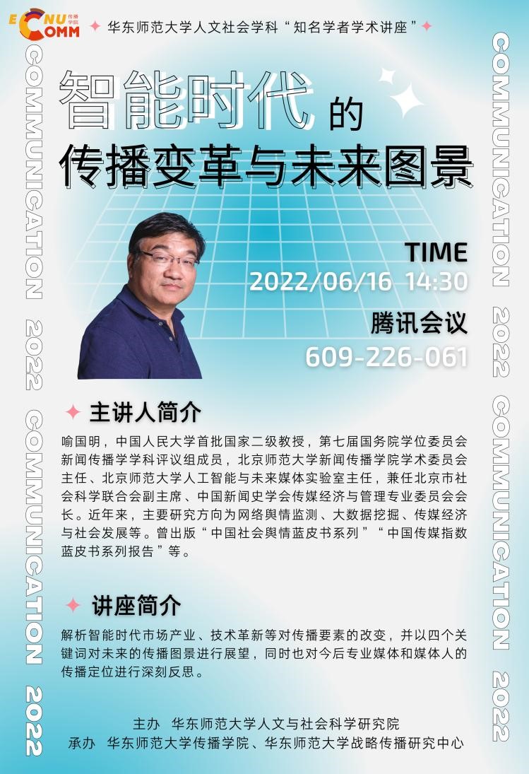 喻国明,中国人民大学首批国家二级教授,第七届国务院学位委员会新闻传播学学科评议组成员,北京师范大学新闻ag亚游 学术委员会主任、北京师范大学人工智能与未来媒体实验室主任,兼任北京市社会科学联合会副主席、中国新闻史学会传媒经济与管理专业委员会会长。近年来,主要研究方向为网络舆情监测、大数据挖掘、传媒经济与社会发展等。曾出版“中国社会舆情蓝皮书系列”“中国传媒指数蓝皮书系列报告”等。
