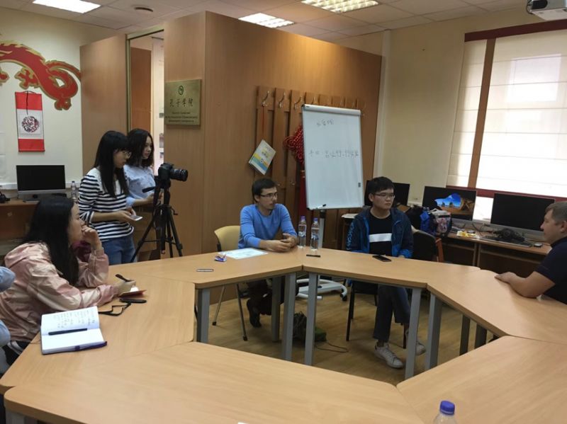 期间,《我的祖国鞑靼斯坦》日报的总编辑Nurgaliyev Minnazim的意外到来一度让没有准备的同学们有点手足无措,随行的记者、老师及时“救场”,就两国纸媒现状与对方进行了沟通,为同学们亲自示范了如何在没有准备的情况下迅速进入状态展开采访。