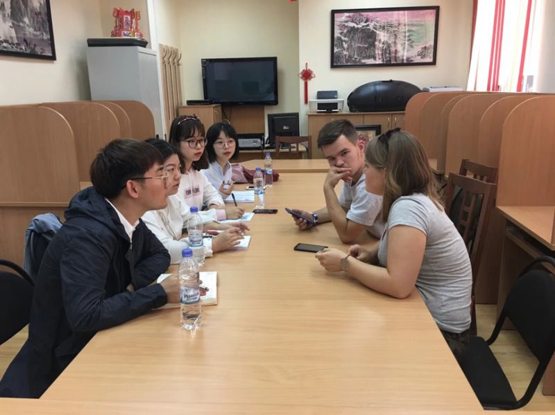 在喀山大学东方系,同学们就马克思主义在当今俄罗斯的研究现状、喀山年轻人的文化认同这两个主题分别采访了哲学系教授Shakirov Alfred和两名东方系的学生。有了之前的经验,加上随队记者、老师的指导,同学们逐渐进入状态,顺利完成了下午的采访任务。