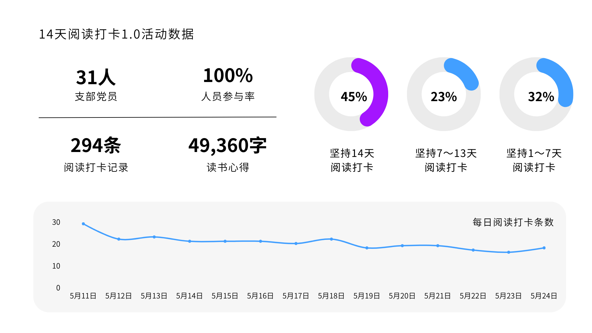 从打卡数据上来看,支部31名党员活动参与率为100%,14天内在线发布294条、共计49360字的读书心得,其中有14名(45%)党员实现了14天每日坚持阅读打卡,68%的支部党员坚持了7天及以上的阅读打卡,平均每人坚持阅读9.5天。