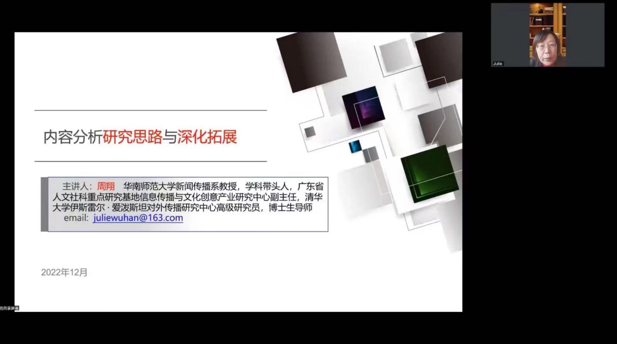 2022年12月14日14:30,ag亚游-真人ag-亚游平台 博思论坛在线上成功召开,华南师范大学新闻传播学系教授周翔老师以“内容分析研究思路与深化拓展”为题展开讲座。ag亚游-真人ag-亚游平台 副院长于晶担任本次会议主持人,数百位专家学者和学生在线参与。