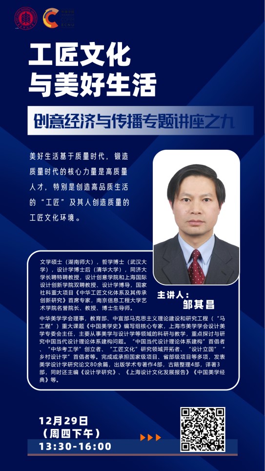 邹其昌,男,1963年12月26日,湖北荆州人,文学硕士(湖南师大),哲学博士(武汉大学),设计学博士后(清华大学),同济大学长聘特聘教授,设计创意学院和上海国际设计创新学院双聘教授、设计学博导,国家社科重大项目《中华工匠文化体系及其传承创新研究》首席专家,南京信息工程大学艺术学院名誉院长、教授、博士生导师。中华美学学会理事,教育部、中宣部马克思主义理论建设和研究工程(“马工程”)重大课题《中国美学史》编写组核心专家,上海市美学学会设计美学专委会主任,主要从事美学与设计学等领域的科研与教学,重点探讨与研究中国当代设计理论体系建构问题。“中国当代设计理论体系建构”首倡者、“中华考工学”创立者、“工匠文化”研究领域开拓者、“设计立国”“乡村设计学”首倡者等。完成或承担国家级项目、省部级项目等多项,发表美学设计学研究论文80余篇,出版学术专著作4部,古籍整理4部(中华考工学三书即《考工记》、《营造法式》和《天工开物》,《三才图会设计文献选编》等),译著3部,同时还主编《设计学研究》(大型设计学理论研究丛刊,已出5部)、《上海设计文化发展报告》(年度系列)《中国美学经典(宋元卷)》等。