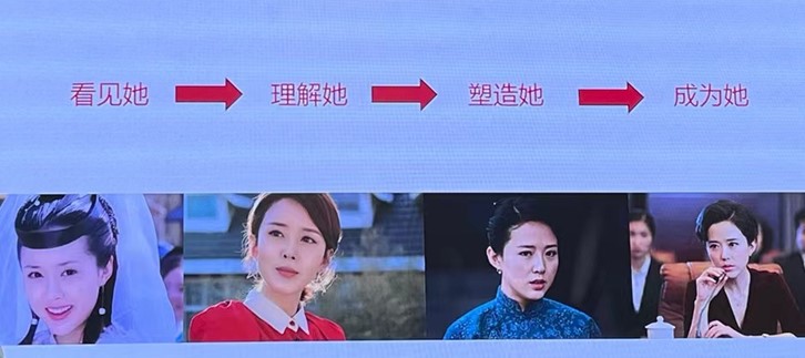 紧接着,颜丹晨结合自己的从业经历,从“真人演员的角色塑造”这一角度出发,详细讲述了影视表演中角色塑造的四个维度:“看见她”、理解她塑造她成为她。颜丹晨认为,文艺必须扎根生活,扎根人民。演员面对角色时,首先要能在生活中看见她,而后去理解,将本人的小我隐藏于角色背后,真正做到一切为角色服务。此外,颜丹晨围绕自己在电影《李保国》和电视剧《北方大地》中部分表演片段的分享与剖析,向同学们阐释了演员在现场即兴创作中的碰撞,以及演员间的相互成就是AI虚拟演员所无法比拟的重要法宝。