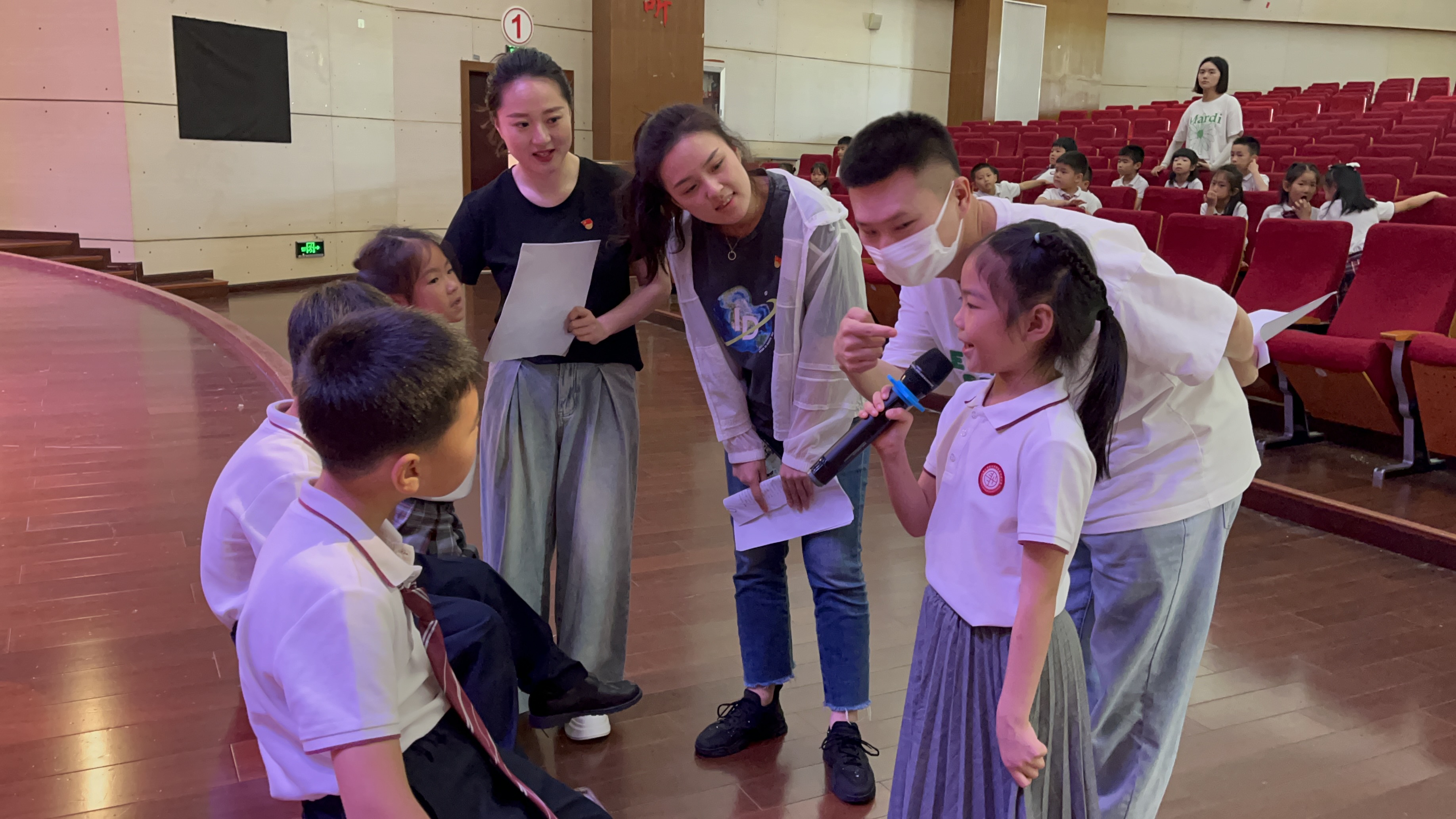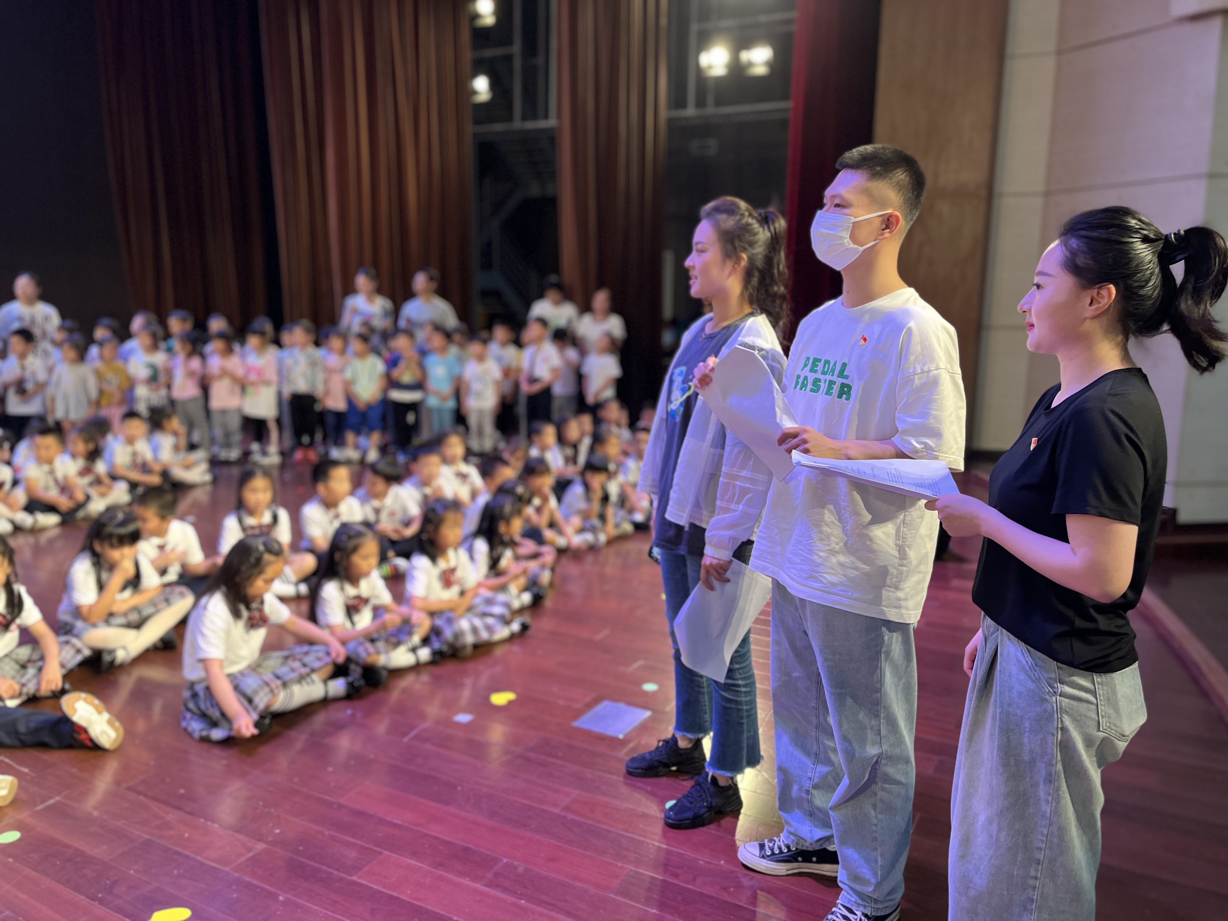 6月15日,周雨洁、余华勇、谭梦心等党员前往华东师范大学附属紫竹幼儿园,以专业的播音主持知识、通俗易懂的语言、以及循循善诱的教学为幼儿园的孩子们进行朗诵指导,并协助排练节目队形,帮助毕业活动整体把关。