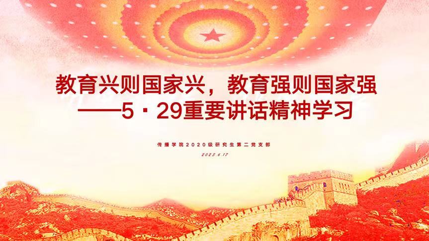 2023年6月17日下午,为深入贯彻5·29重要讲话精神,ag亚游 2020级硕士研究生第二党支部举行“教育兴则国家兴,教育强则国家强”主题党日活动,集体学习习近平总书记重要讲话,明晰中国特色社会主义教育发展道路。