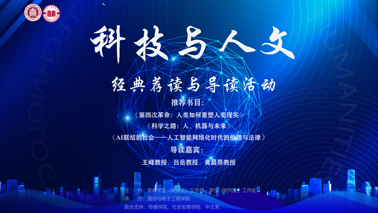 藉校园主题活动日之际,华东师范大学三位来自人文与传播、社会发展、人工智能技术等不同学科领域的专家,聚焦科技发展与社会新变,深度导读科技与人文前沿专著,以对谈形式探讨人工智能极速发展下的科技与人文何以互融共进的问题。