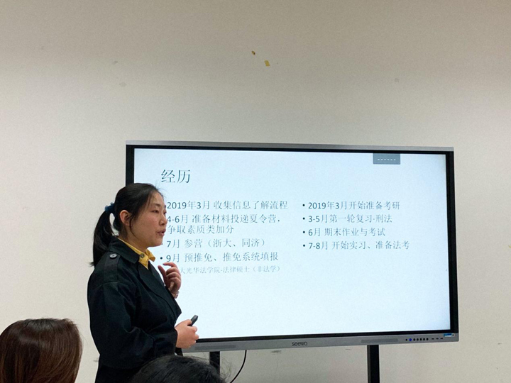 随后,新闻专业的党格致同学向学弟学妹们讲述了自己参加复旦大学和浙江大学保研面试的经历,并提到了专业型硕士与学术型硕士、学校排名与城市地域等的选择,强调了选择一定要遵从自己的内心。党格致同学还强调了要依据自己的节奏学习,随后她提到了自己参加复试时的一段有趣经历让同学们感受到复试并没有那么困难那么严肃,只要准备好“套路”,一切都能迎刃而解。最后党格致同学提到了自己交大夏令营落选的经历,让大家明白了“一切都是最好的安排”。