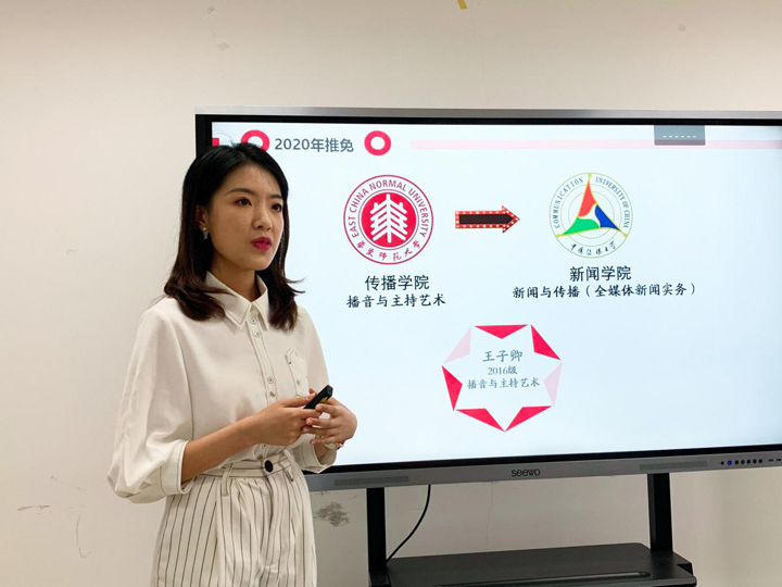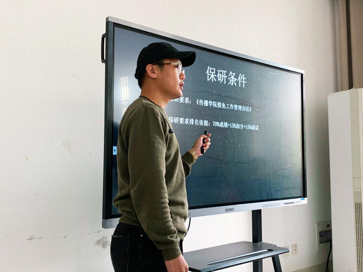首先进行分享的是来自广告专业的邵一鸣同学,他成功保送至华东师范大学新闻与传播专业。邵一鸣同学结合自身保研的经历,分享了其参加夏令营并拿到中国科学院大学传播学和同济大学法学院法律硕士的优秀营员的经历,他特别强调了学年论文的重要性,尤其是针对跨专业的情况下拿下外校offer这种情况。他强调了保研对本科阶段成绩的要求,并从自身的成绩与综合加分出发,讲述了获得保研资格的心得与步骤。邵一鸣同学还向同学们介绍了保研工作细则,让同学们更好地了解到保研的方方面面。