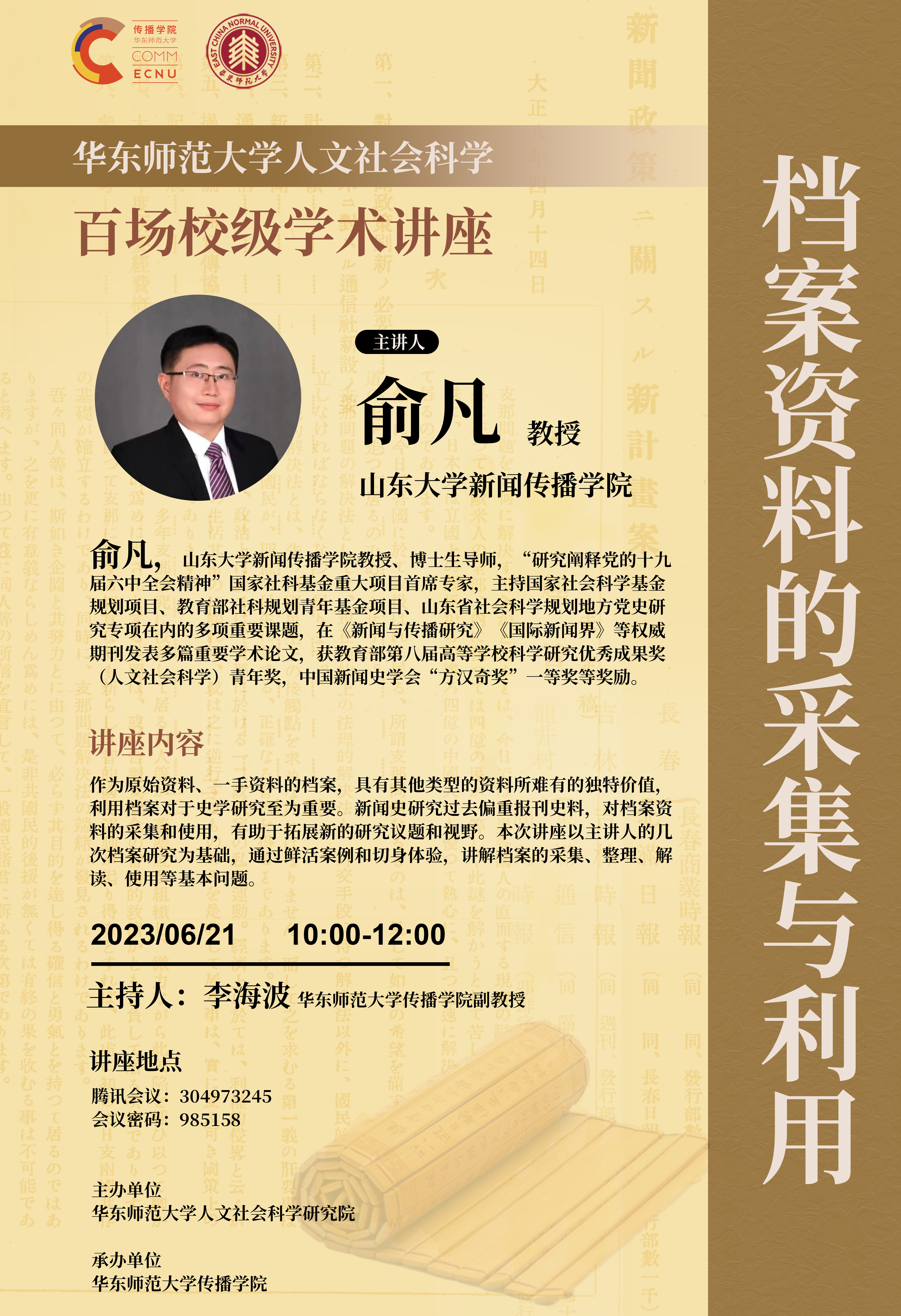 作为原始资料、一手资料的档案,具有其他类型的资料所难有的独特价值,利用档案对于史学研究至为重要。新闻史研究过去偏重报刊史料,对档案资料的采集和使用,有助于拓展新的研究议题和视野。本次讲座以主讲人的几次档案研究为基础,通过鲜活案例和切身体验,讲解档案的采集、整理、解读、使用等基本问题。