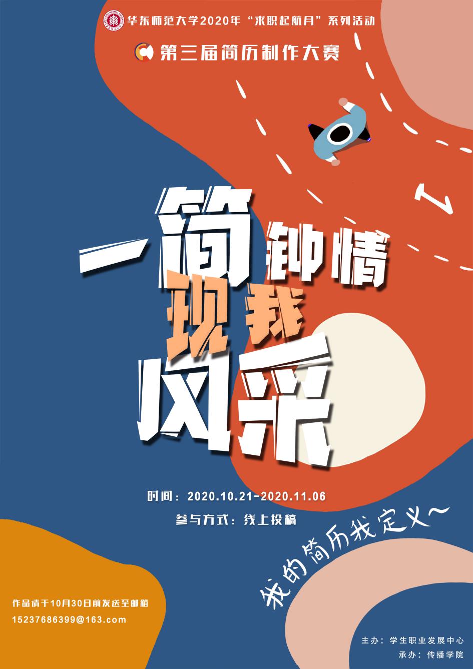 现在,华东师范大学2020年“求职启航月”就能为你未来的征途装点行囊!而第一份秘密武器就是“一简钟情,现我风采”简历制作大赛,这是ag亚游 求职起航月系列活动之一。