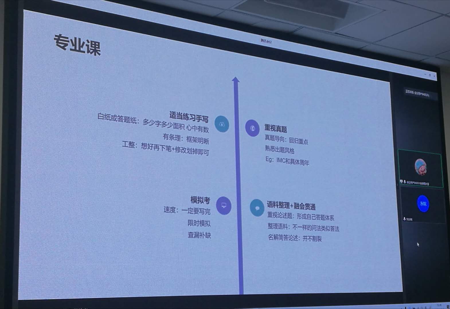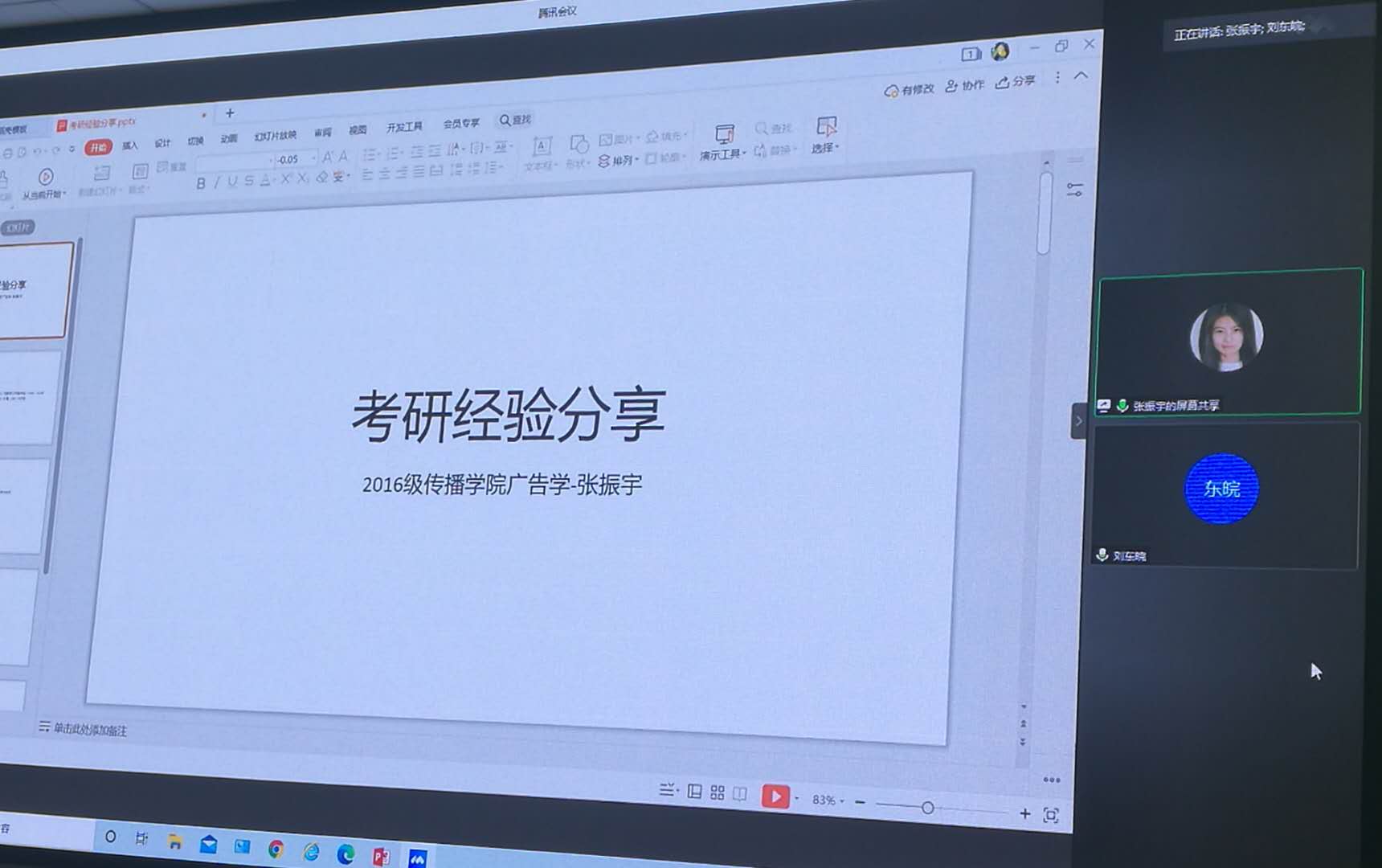 最后进行分享的是从ag亚游-真人ag-亚游平台 广告学专业毕业的张振宇学姐,她通过考研,进入中国人民大学的电影学专业深造。由于远在北京,张振宇以线上分享的形式向同学们讲述了自己的考研经历。她建议学弟学妹们可以结合自己未来的职业规划来确定考研的目标,包括以后就业的方向、想要留在的城市等。在制定好计划后,要有条理的一步步去完成自己的目标,保持一个良好心态,坚持就是胜利。