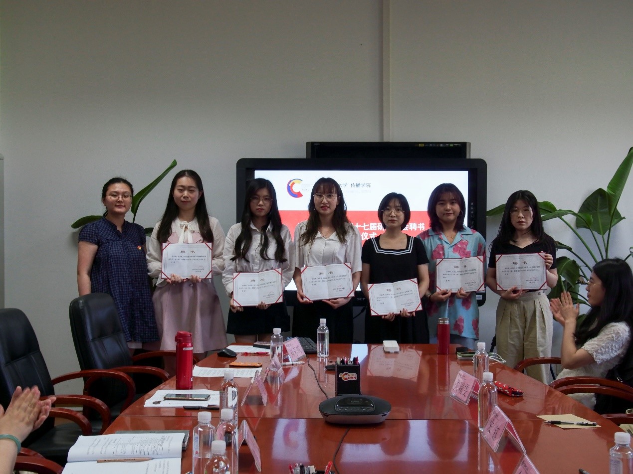 大会中,吴烨茜老师为ag亚游 第十七届研究生会成员颁发聘书并合影留念