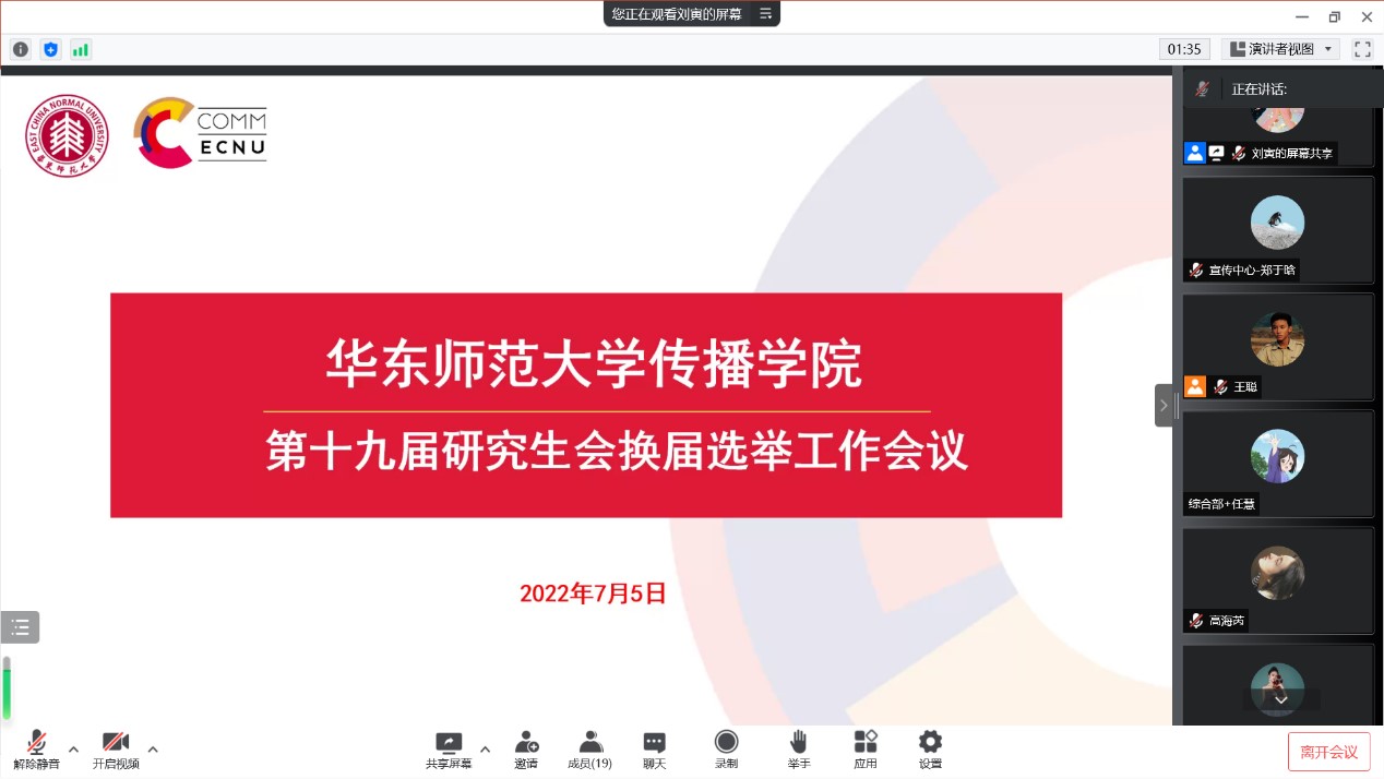 2022年7月5日上午10点,ag亚游-真人ag-亚游平台 第十九届研究生换届选举工作会议以线上形式召开,ag亚游 团委书记吴烨茜老师、ag亚游 第十八届研究生会全体成员及各班学生代表出席了本次会议。工作会议由ag亚游 第十八届研究生会主席团成员王聪主持。