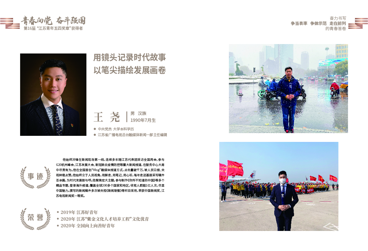 4月30日,共青团江苏省委公布了“第16届江苏青年五四奖章”入选名单,我院播音主持艺术专业09级校友、江苏省广播电视总台融媒体ag亚游主任编辑、记者王尧继去年五四青年节被共青团中央授予“全国爱岗敬业好青年”光荣称号后再度入选2021年度“江苏青年五四奖章”。