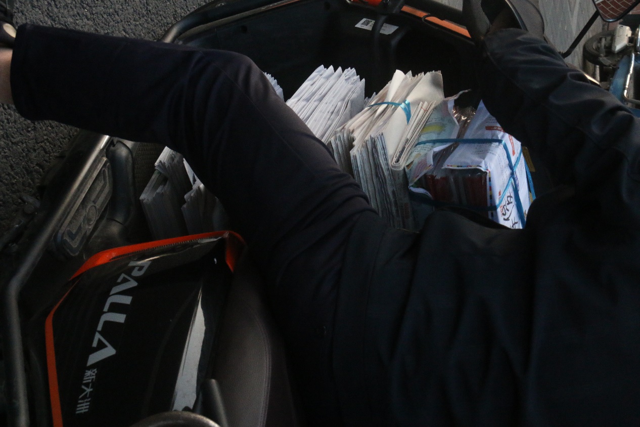 报纸堆满了电动车前踏板,但跟过去比已经少得多了