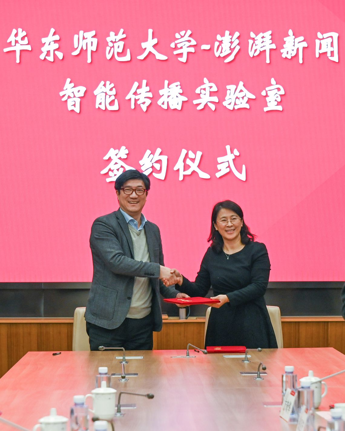2023年11月23日下午,华东师范大学与澎湃新闻携手建立的“华东师范大学-澎湃新闻”智能传播实验室签约仪式在华东师范大学(中山北路校区)办公楼小礼堂举行。