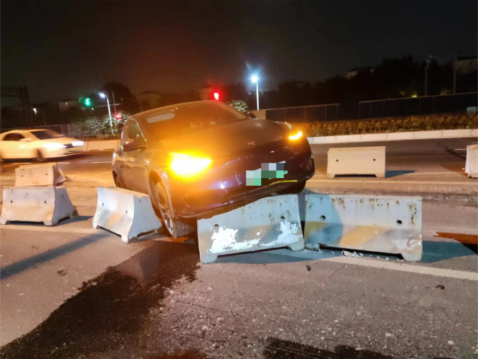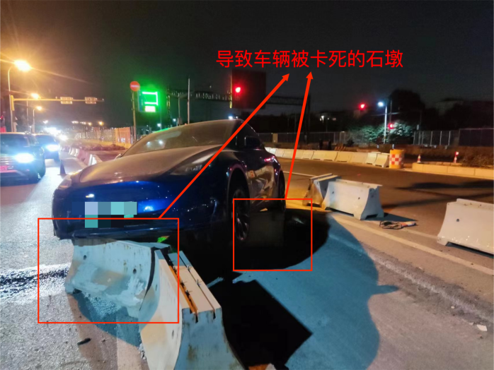 事故现场:特斯拉斜骑石墩,周围警示标识不足