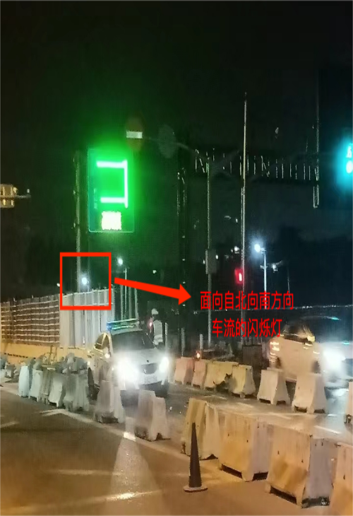 记者现场观察,事发路段采用较为昏暗的暖黄色路灯,正常行车时难以预判前方路况,非常需要警示灯来提示该路段施工区域的路况变化。记者在事故现场找到了一盏闪烁的警示灯,悬挂在道路中央的红绿灯路杆距地面约3米的位置,面向自北向南方向行驶车辆。对于本次事故车辆这种自南向北行驶的车辆,只能看到警示灯后侧太阳能电池板部分,灯光信号并不可见,起不到警示作用。