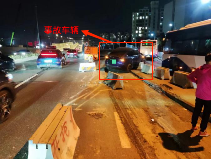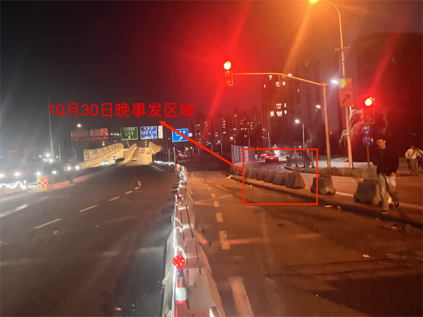 事故起因疑似道路作业区域警示标识与设施不足,据了解,事发当晚施工人员已介入改造。记者在11月2日下午重访事故现场,发现安全隐患已消除。