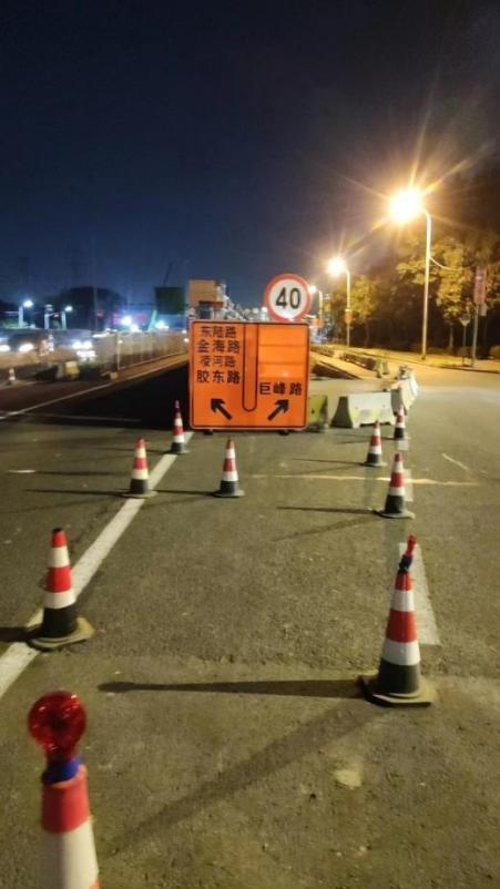 晚上20点09分,两位交警抵达事故现场对事故车辆和现场情况进行了拍照存档,并询问事发原因。据沈交警介绍,事发路段附近有设置路标以及警示锥来引导自南向北行驶的车辆正确汇车。记者在距离事发地200m左右的杨高北路双桥路路口找到了沈交警所说的路标和警示锥。